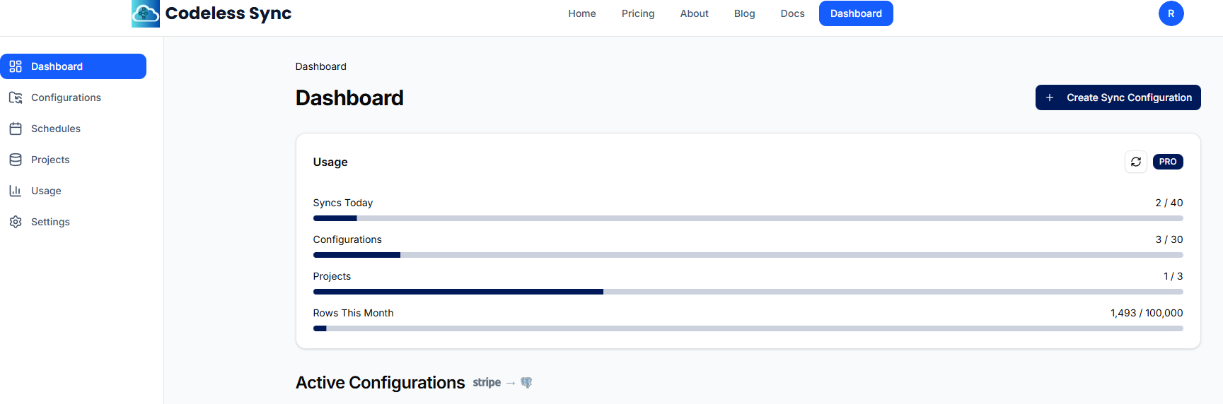 Log into your Codeless Sync dashboard and click Create Sync Configuration. This opens a 5-step wizard that walks you through the setup.