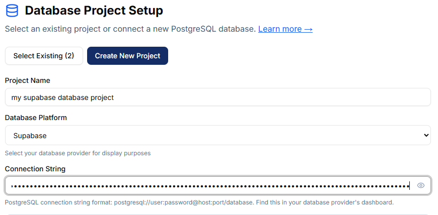 Next, connect to your PostgreSQL database. If you've already added a project, select it from the dropdown. Otherwise, click New Project and enter your connection string.